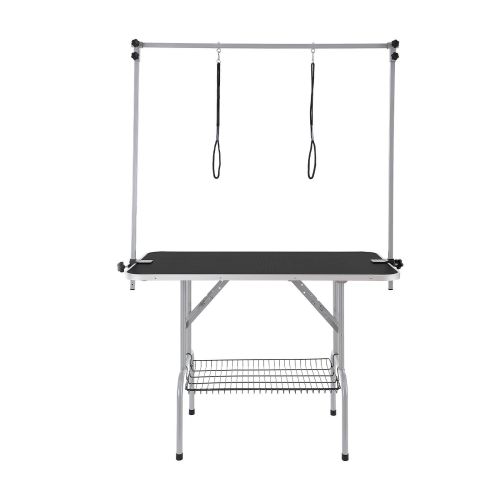 4.Easy Installation: This pet grooming table is quick and convenient to install, requiring only four simple steps: Step 1 - unfold the grooming table and place it level; Step 2 - securely clamp the 2 iron fixtures onto the table; Step 3 - attach the H-shaped double arms; Step 4 - finally, install the storage shelf.
